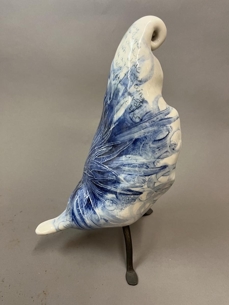 porcelain with cobalt painting, writing and serigraphy, and wrought iron stand